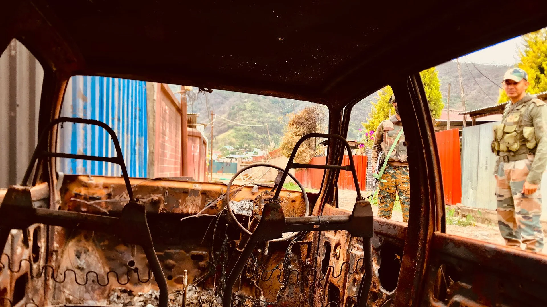 Personnel from the Indian Army look at a burnt car in Imphal, Manipur. Photo by Vishal Arora